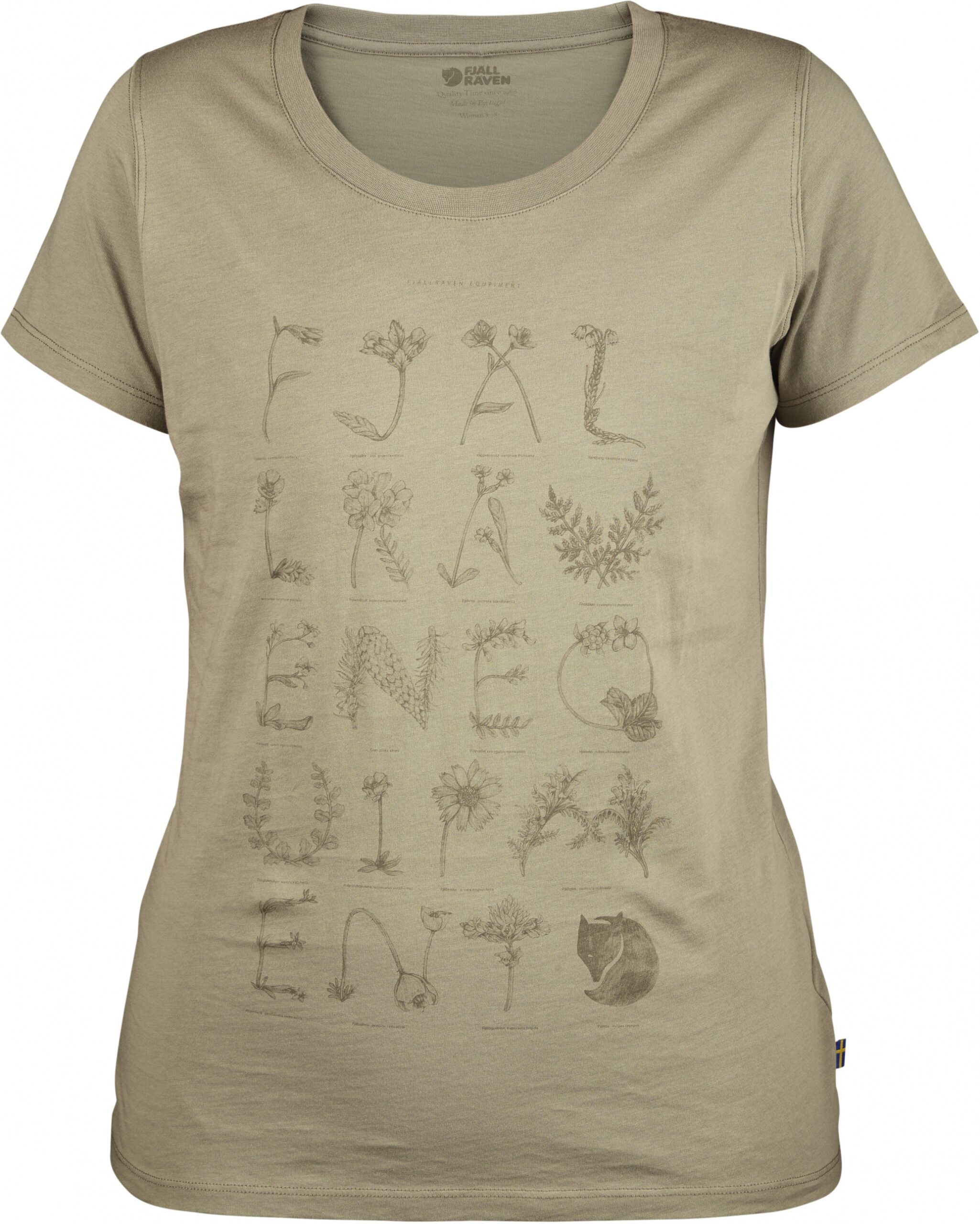 Pohodlné tričko s krátkym rukávom s okrúhlym výstrihom z organickej bavlny. Potlačené textom „Fjällräven Equipment“ na prednej časti, s písmenami z kvetín, ktoré rastú pozdĺž turistickej cesty King’s Trail vo Švédsku.